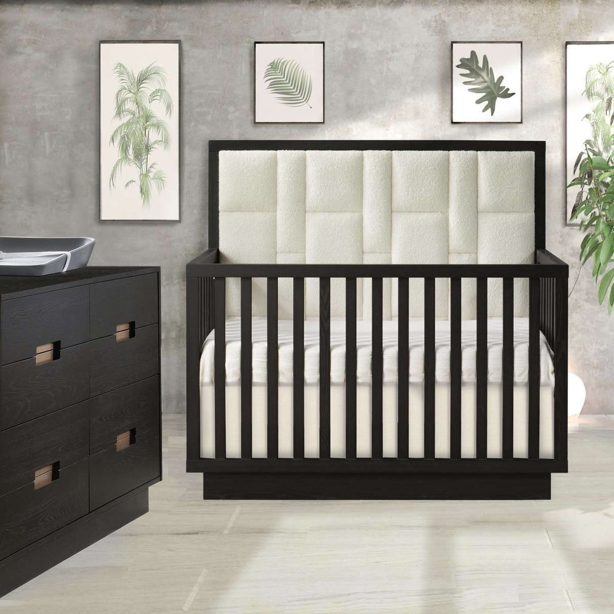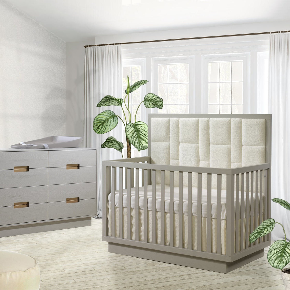 • Convertible crib with a thicker and higher 53’’ headboard with a geometric upholstered panel in Bouclé Beige
